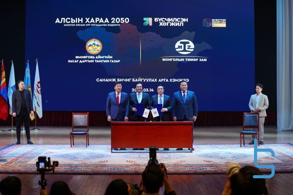 “Монголын төмөр зам” ТӨХК болон Өмнөговь аймгийн Засаг даргын Тамгын газартай хамтран Цогтцэций сумын Тавантолгой бүлэг ордоос Даланзадгад хот чиглэлийн төмөр замын төслийн талбайд харилцан ойлголцлын санамж бичигт гарын үсэг зурлаа.