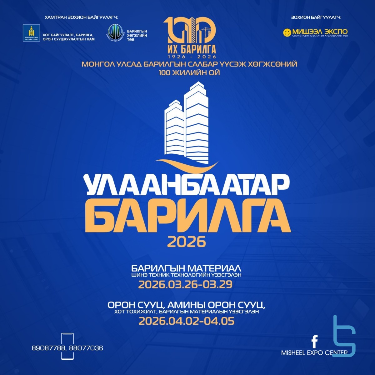 Монгол улсад барилгын салбар үүсэж хөгжсөний "100 жил"-ийн ойг тохиолдуулан “Мишээл Экспо” ХХК-с 20 дахь жилдээ уламжлал болгон Хот байгуулалт, барилга, орон сууцжуулалтын яам, Барилгын хөгжлийн төвийн дэмжлэгтэйгээр барилгын салбарын хамгийн том цуврал үзэсгэлэн "Улаанбаатар барилга – 2026" үзэсгэлэн зохион байгуулагдана.