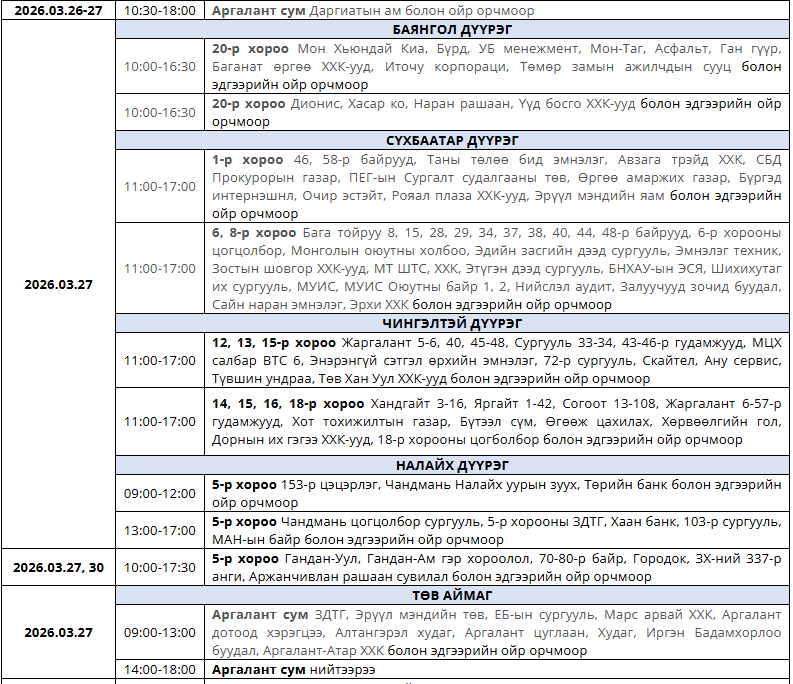 Улаанбаатар цахилгаан түгээх станц маргааш (2026.03.27) дараах байршилд цахилгаан хязгаарлана. Нийт 12 байршил багтжээ. Төв аймгийн Аргант суманд нийтээрээ цахилгаангүй болно гэв.