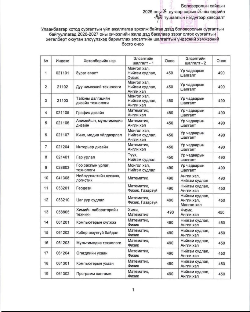 2026-2027 оны хичээлийн жилд томоохон их, дээд сургуулиудын бакалаврын хөтөлбөрт оюутан элсүүлэх журам, элсэлтийн шалгалтын босго онооны жагсаалтыг танилцуулж байна.