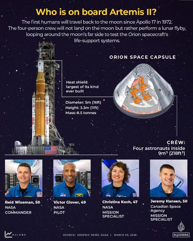 АНУ-ын сансар судлалын НАСА агентлаг 1972 оноос хойш анх удаа “Artemis-2” хөтөлбөрийнхөө хүрээнд дөрвөн сансрын нисэгчээ сар руу илгээлээ. Дэлхийн дагуулыг тойрох аялал 10 орчим хоног үргэлжилнэ.