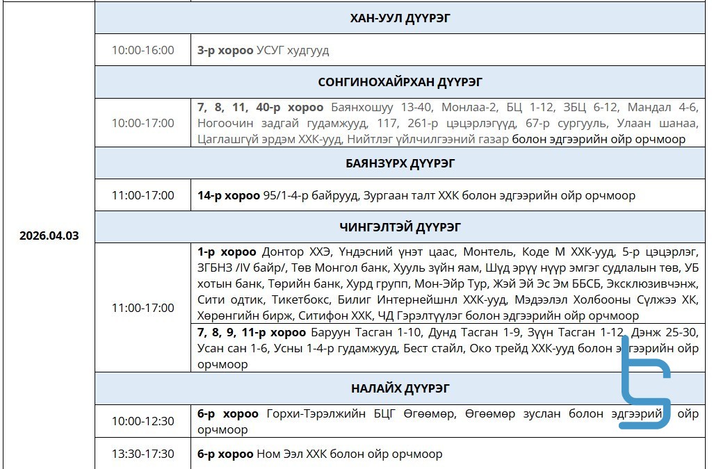 Өнөөдөр буюу дөрөвдүгээр сарын 03-ний өдөр цахилгаан шугам тоноглолд засвар үйлчилгээ хийх хуваарийг танилцуулж байна. Тодруулбал, Хан-Уул, Сонгинохайрхан, Чингэлтэй, Баянзүрх, Налайх дүүргүүдэд цагийн хуваарийн дагуу цахилгаан хязгаарлалт хийнэ.