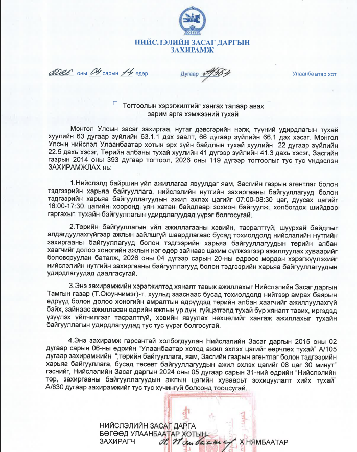 Мөн төрийн байгууллагын үйл ажиллагааны хэвийн, тасралтгүй, шуурхай байдлыг алдагдуулахгүйгээр ажлын зайлшгүй шаардлагаас бусад тохиолдолд нийслэлийн төр, захиргааны байгууллагын албан хаагчид 2026 оны 4 дүгээр сарын 20-ны өдрөөс долоо хоногийн нэг өдөр зайнаас цахимаар ажиллахаар боллоо.