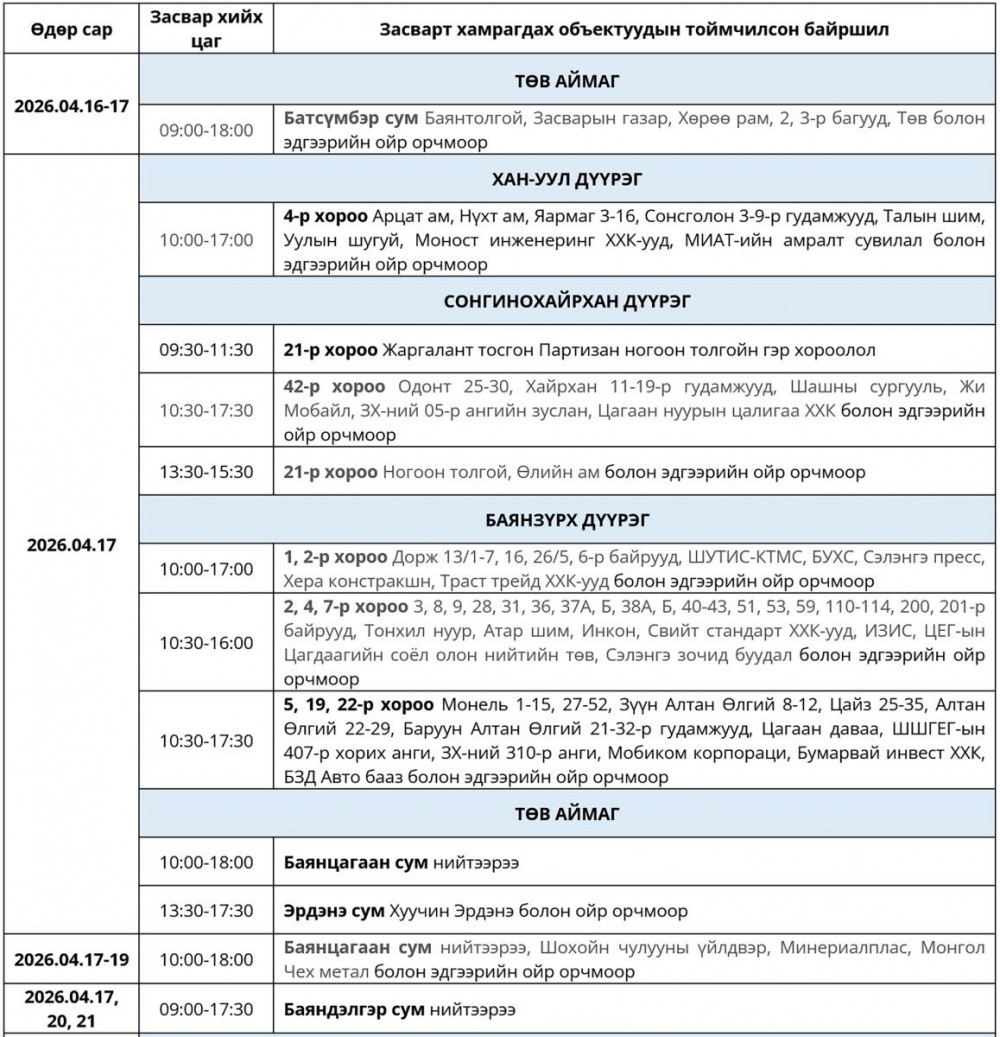 Өнөөдөр буюу дөрөвдүгээр сарын 17-ний өдөр цахилгаан шугам тоноглолд засвар үйлчилгээ хийх хуваарийг танилцуулж байна. Тодруулбал, Сонгинохайрхан, Баянзүрх, Хан-Уул дүүргүүдэд цагийн хуваарийн дагуу цахилгаан хязгаарлалт хийнэ.