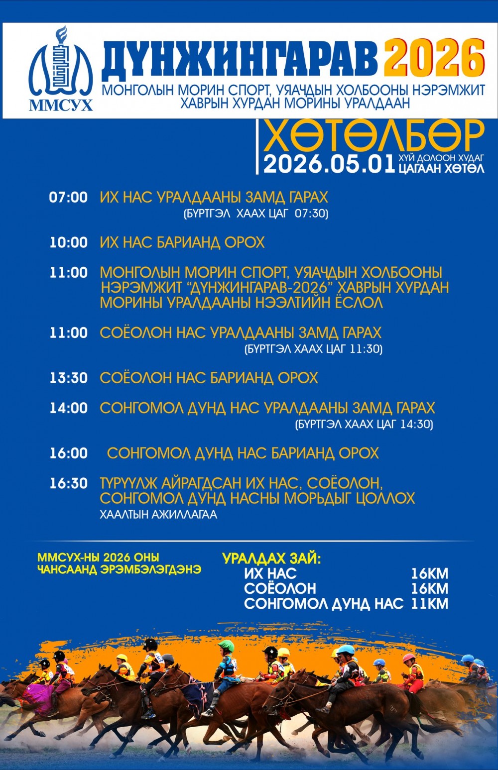 Монголын Морин Спорт, Уяачдын Холбоо-ны нэрэмжит “ДҮНЖИНГАРАВ-2026” хаврын хурдан морины уралдаан 2026 оны 05 дугаар сарын 01-ний өдөр Хүй долоон худаг, Цагаан хөтөлд зохион байгуулагдана. Тус уралдаан ИХ НАС, СОЁОЛОН, СОНГОМОЛ ДУНД насны ангиллаар зохион байгуулагдах бөгөөд уяачид, морь сонирхогч та бүхнийг өргөнөөр оролцохыг урьж байна.